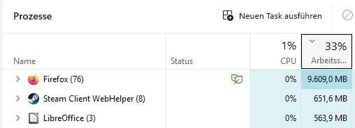 Am meisten aber schocken mich immer noch die Browser. Ich hab natürlich mal quergelesen, warum die heutzutage so viel Arbeitsspeicher benötigen und mir persönlich könnte es gerade nicht egaler sein, weil das in meinem Rechner die Ressource mit den meisten Reserven ist … aber als ich neulich mal in den Taskmanager geschaut habe, hat es mich trotzdem fast umgehauen: