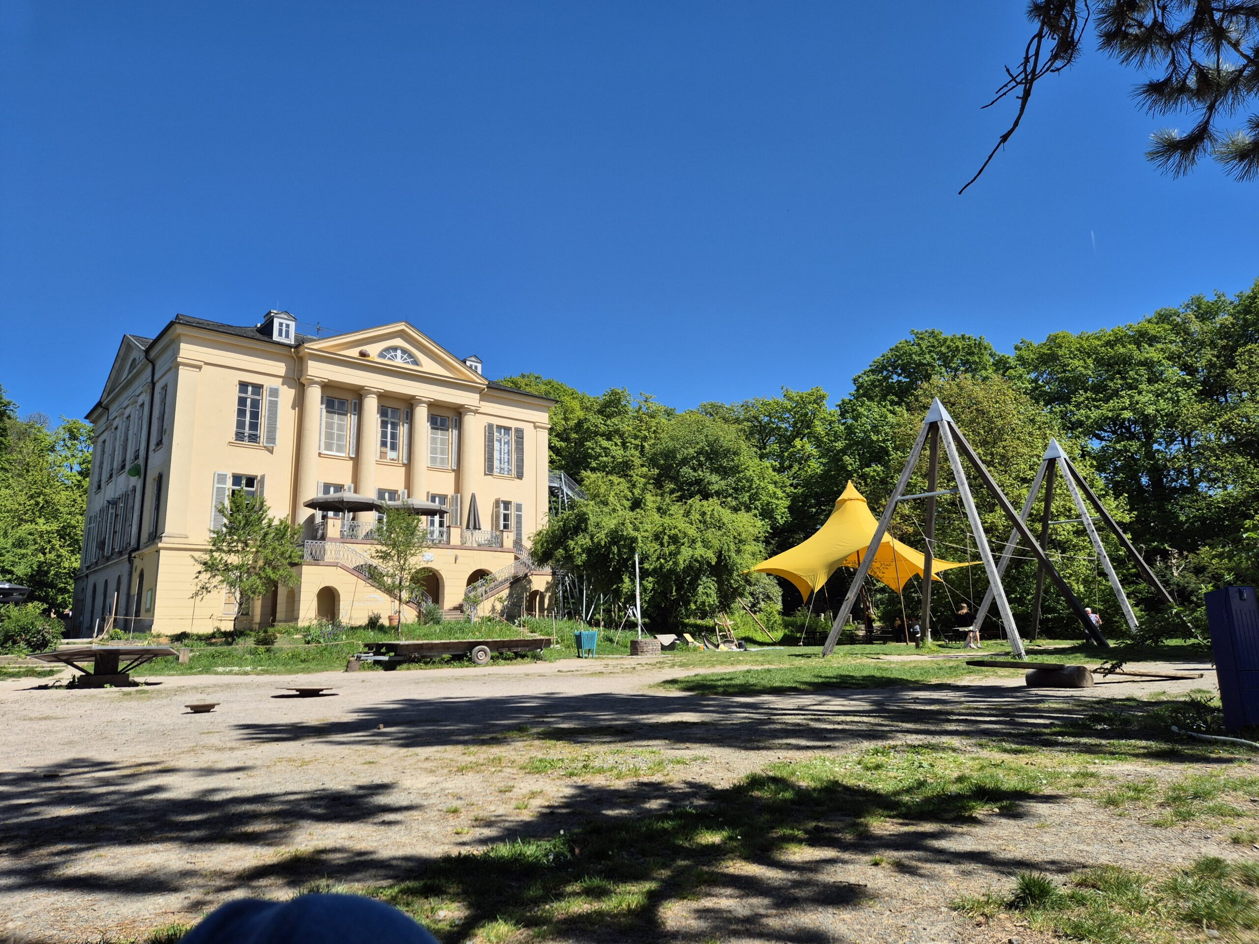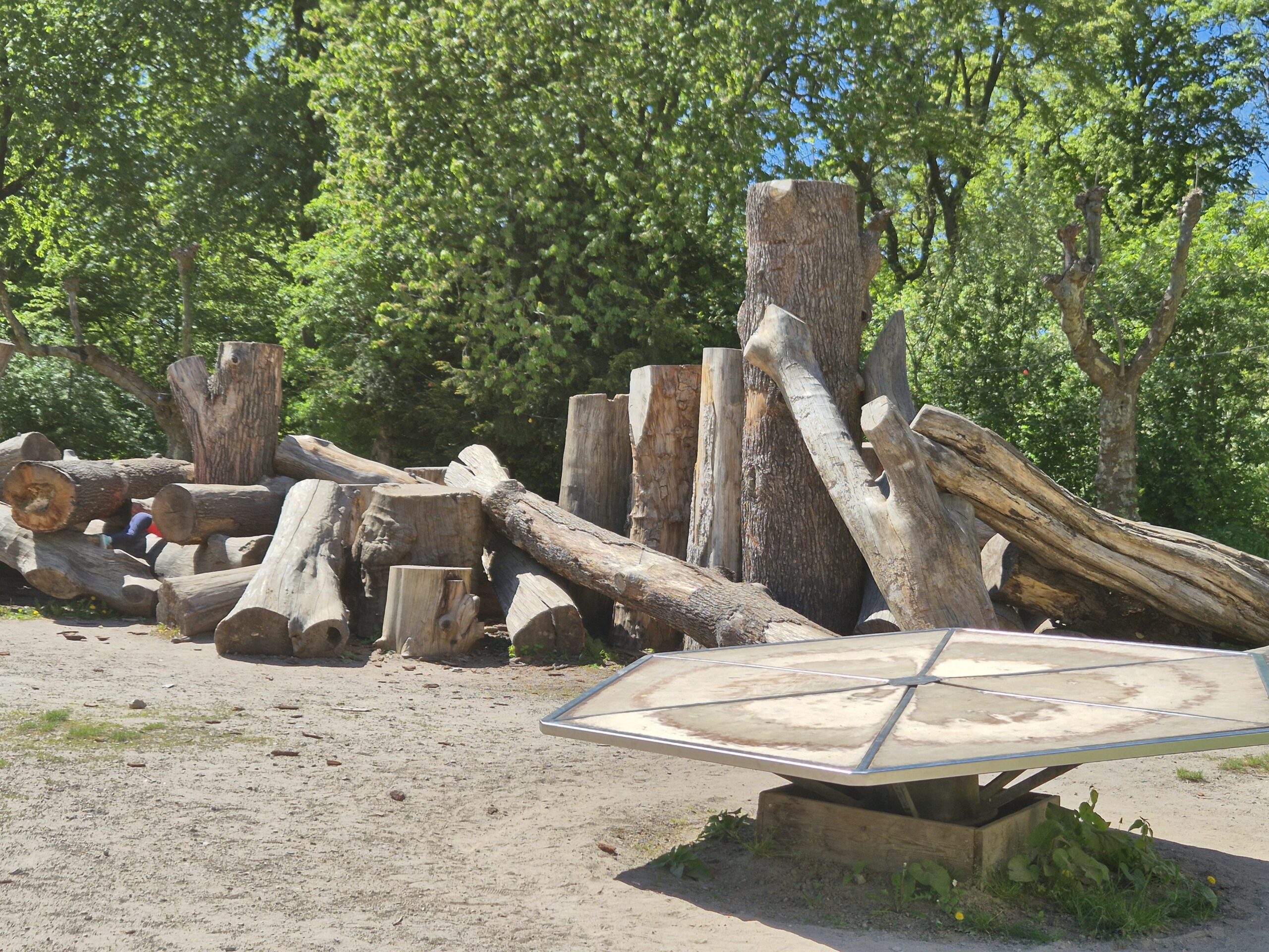 Auf dem Außengelände gab es dann verschiedene Spielmöglichkeiten wie etwa den unten gezeigten Holzstapel, der unsere Kids an dem Tag stundenlang beschäftigt hat, aber auch einen Wasserspielplatz, einen Barfußpfad, Schaukeln und eine Menge Zeug einfach.