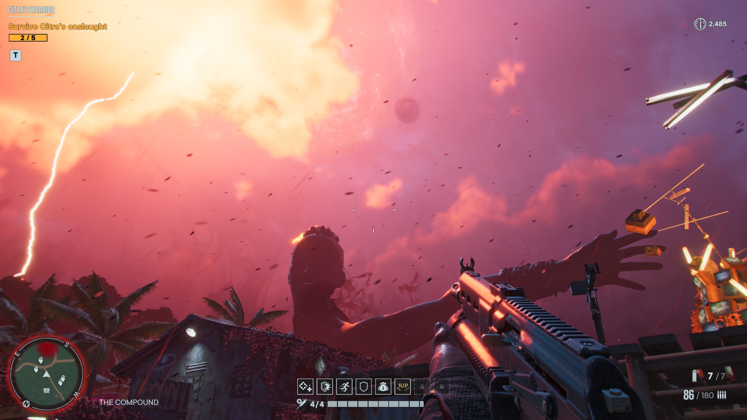 Und dann sind da die DLCs. Ich verstehe es nicht. Die Grundidee der „Inside the Mind“-Trilogie ist für Fans super: Man schlüpft in die Geisteswelt der Antagonisten der Teile 3 bis 5: Vaas Montenegro, Pagan Min und Joseph Seed. Welten, die die surreale Seite von Far Cry bedienen, voller Fantasmen und kruder Versatzstücke aus den Originalspielen. Im Grunde fantastischer Fan-Service, der alte (Anti-)Helden wieder auferstehen lässt, an der Lore weiterarbeitet … und dann bringen sie drei so identische DLC raus, dass sie quasi nur unterschiedliche Skins haben, verticken sie aber zu Beginn recht teuer und einzeln. Noch dazu sind es eher zwar Shooter, aber vom Aufbau eher rogue-like, also komplett weg davon, wie Far Cry normalerweise funktioniert.