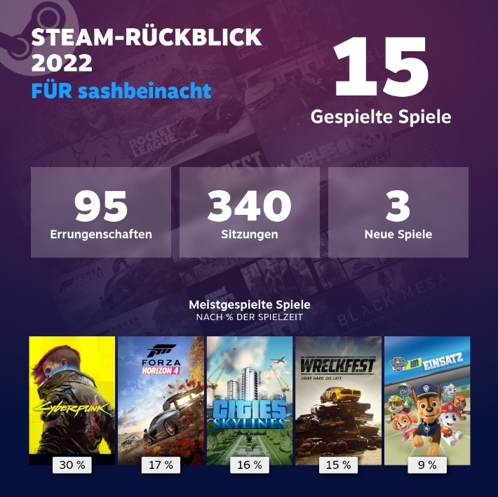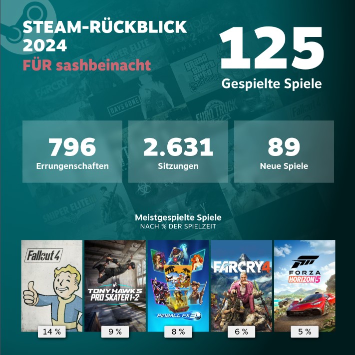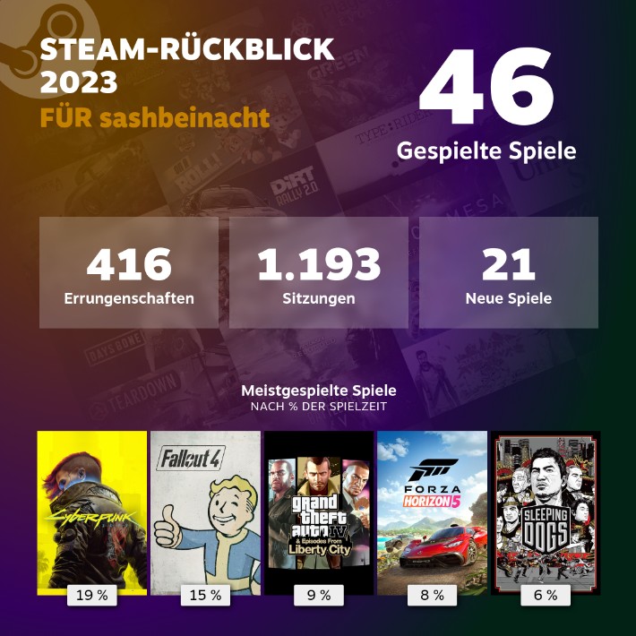 Für 2023 hatte ich beschlossen, dass ich mal wieder ein bisschen ernsthafter spiele. Sprich: Nicht immer nur die gleichen 5 Spiele. Hier die seitdem veröffentlichten Steam-Jahresrückblick-Zusammenfassungen: